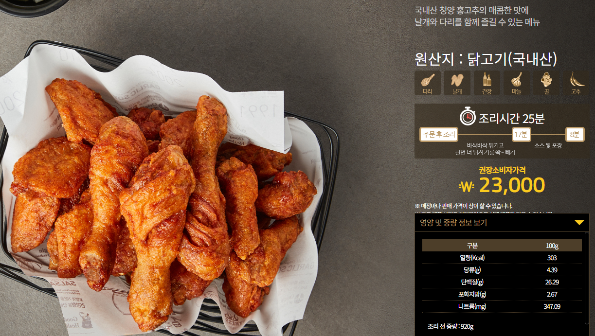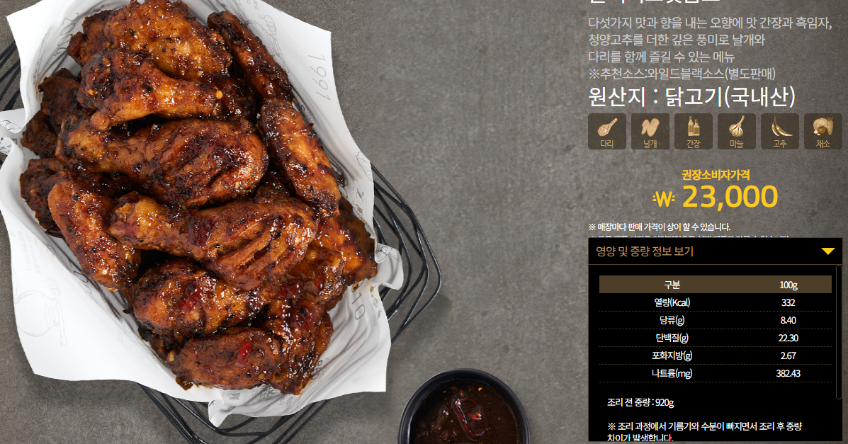 매니아층이 있는 교촌치킨 메뉴추천 블랙시크릿콤보는 다섯가지 맛과 향을 내는 오향에 맛간장 흑임자 청양고추를 더해 깊은 풍미로 날개와 다리를 함께 즐길 수 있는 메뉴입니다. 블랙시크릿콤보의 가격은 23,000원으로 열량은 100g 당 332kcal입니다.