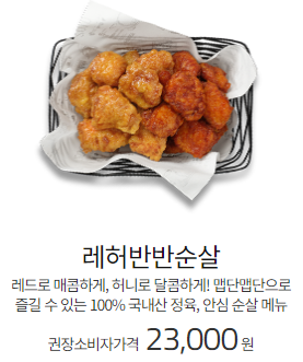 교촌치킨 추천메뉴로 레허반반순살이 있습니다. 허니콤보의 달달함과 레드콤보의 매콤함이 잘 어울리는 메뉴로 맵단맵단으로 즐길 수 있는 메뉴입니다. 하나만 먹으면 느끼하거나 물리는 분들에게는 적극 추천하는 메뉴입니다. 레허반반순살의 가격은 23,000원이며 열량은 100g당 363.5kcal입니다.