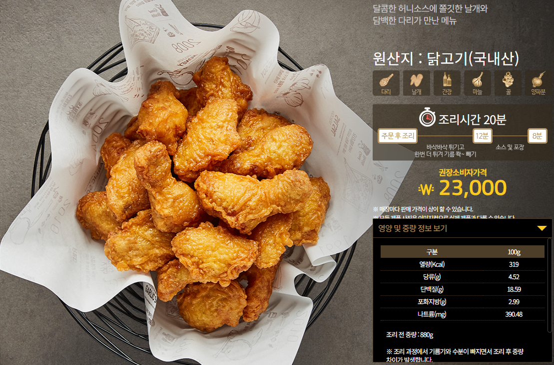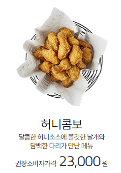 교촌치킨하면 떠오르는 대표 메뉴인 허니콤보입니다. 교촌치킨 메뉴 중 무엇을 가장 좋아하는지 물어보았을 때 항상 가장 먼저 나오는 치킨으로 교촌치킨의 시그니처 같은 메뉴입니다. 달콤한 허니소스에 쫄깃한 날개와 담백한 다리가 만난 교촌치킨 허니콤보의 가격은 23,000원입니다. 교촌치킨 추천메뉴인 허니콤보 칼로리는 100g당 319kcal입니다.