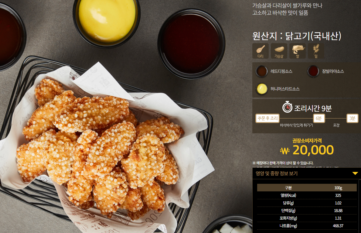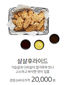 고소한 맛과 바삭한 식감을 원하는 분들을 위한 교촌치킨 메뉴추천인 살살후라이드입니다. 가슴살과 다리살이 쌀가루와 만나 고소하고 바삭한 맛과 식감이 일품입니다. 가격은 20,000원이며 칼로리는 100g당 325kcal입니다.