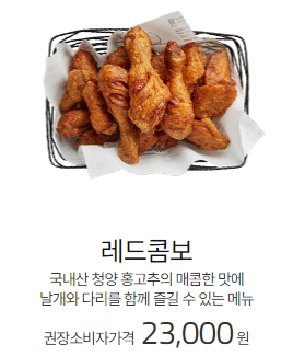 허니콤보의 달달한 맛을 좋아하지 않는다면 교촌치킨 메뉴추천으로 레드콤보가 있습니다. 레드콤보는 국내산 청양 홍고추의 매콤한 맛에 날개와 다리를 함께 즐기는 메뉴입니다. 레드콤보 가격은 23,000원입니다. 교촌치킨 추천메뉴 레드콤보의 칼로리는 100g당 303kcal입니다.