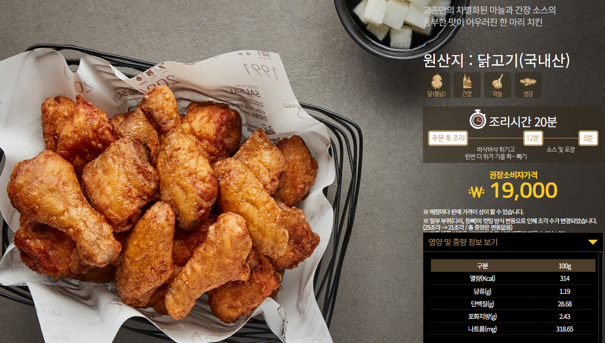 레드콤보나 허니콤보처럼 맛이 강한 치킨을 좋아하지 않는다면 교촌오리지날을 드셔보세요. 교촌오리지날은 교촌만의 차별화된 마늘과 간장 소스의 풍부한 맛이 어우러진 치킨으로 남녀노소 모두 좋아할 추천메뉴입니다. 교촌치킨 추천메뉴 교촌오리지날 가격은 19,000원이며 칼로리는 100g당 314kcal입니다.