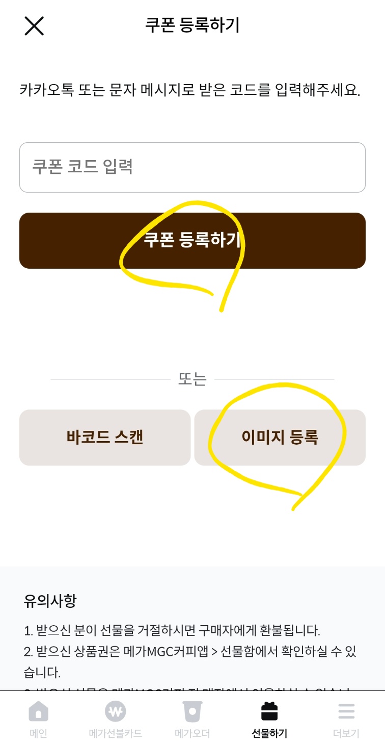 2. 선물함 내 중간에 있는 쿠폰 등록하기를 클릭합니다. 그 뒤 쿠폰 등록하기를 눌러줍니다. 메가커피 기프티콘 등록 방법에는 바코드 스캔과 이미지 등록 두 가지 방법이 있습니다. 핸드폰에 기프티콘 이미지가 있다면 이미지 등록을 통해 편하게 기프티콘 등록이 가능합니다.