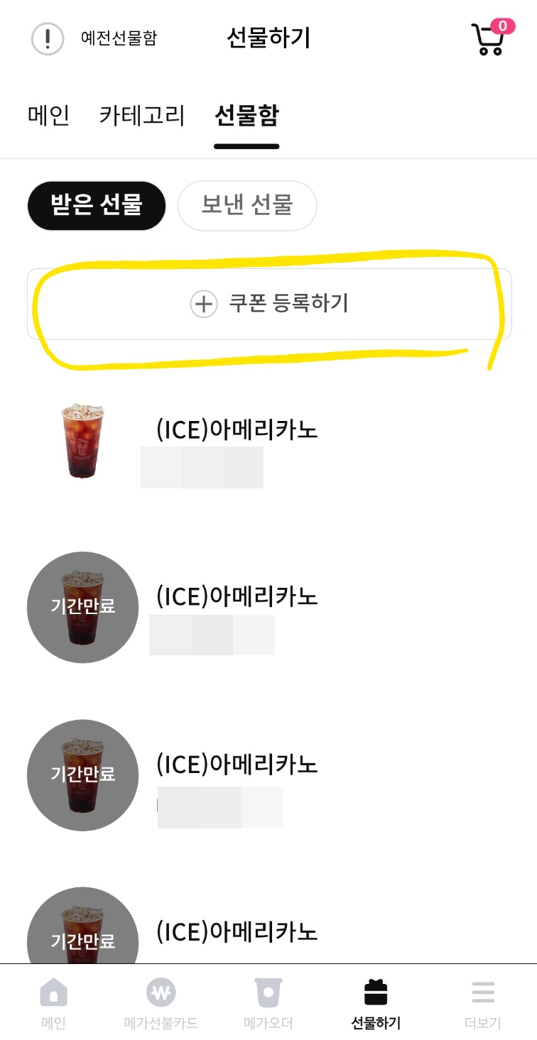 1. 메가커피 어플 접속 후 하단에 있는 선물하기를 클릭합니다. 선물하기 탭에 있는 위쪽 메인, 카테고리, 선물함 중 선물함을 클릭합니다.