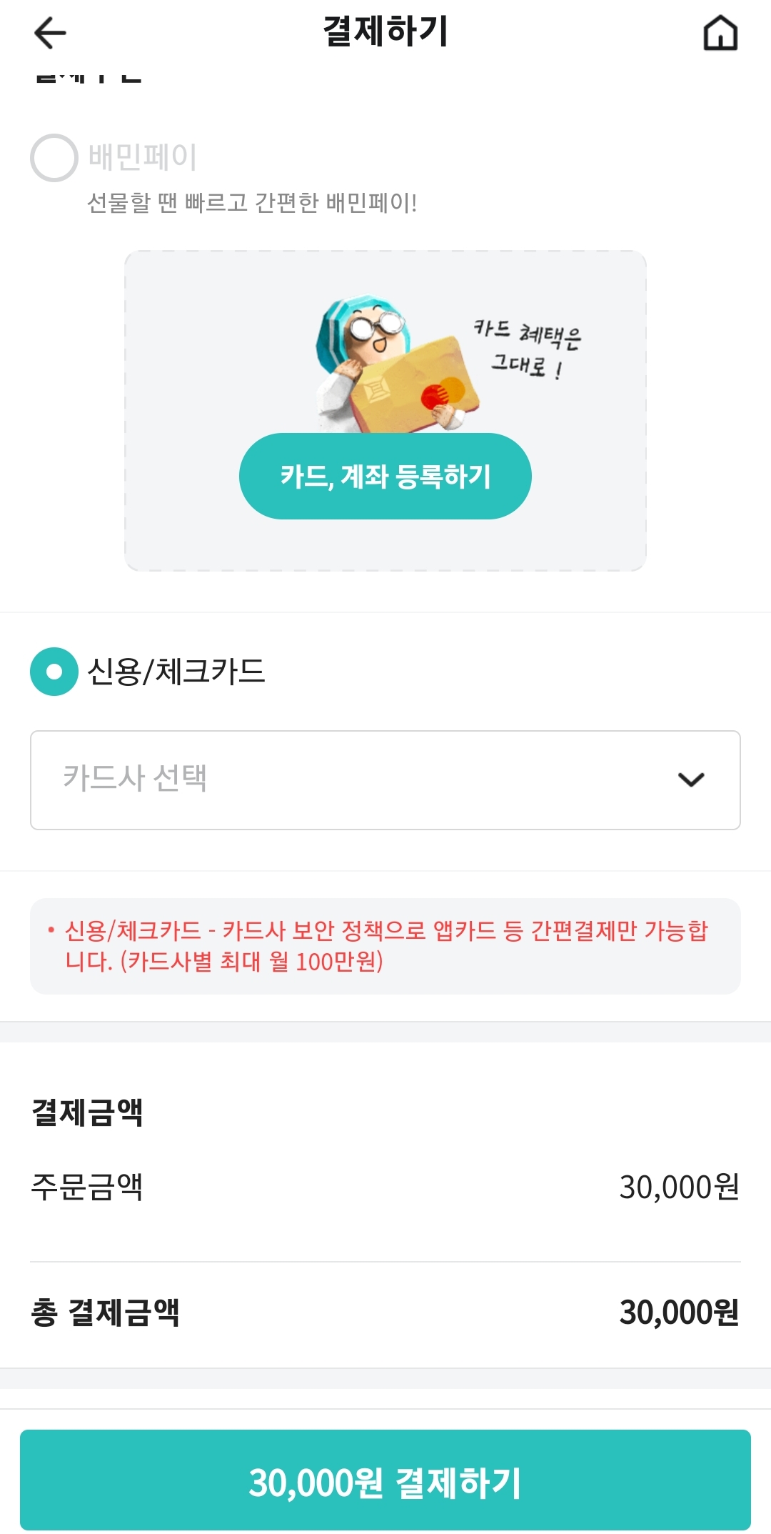 6. 마지막으로 결제를 해주시면 배달의민족 상품권 결제가 완료되고, 상대방에게 전달할 수 있습니다. 결제는 배민페이, 신용/체크카드 모두 가능합니다.