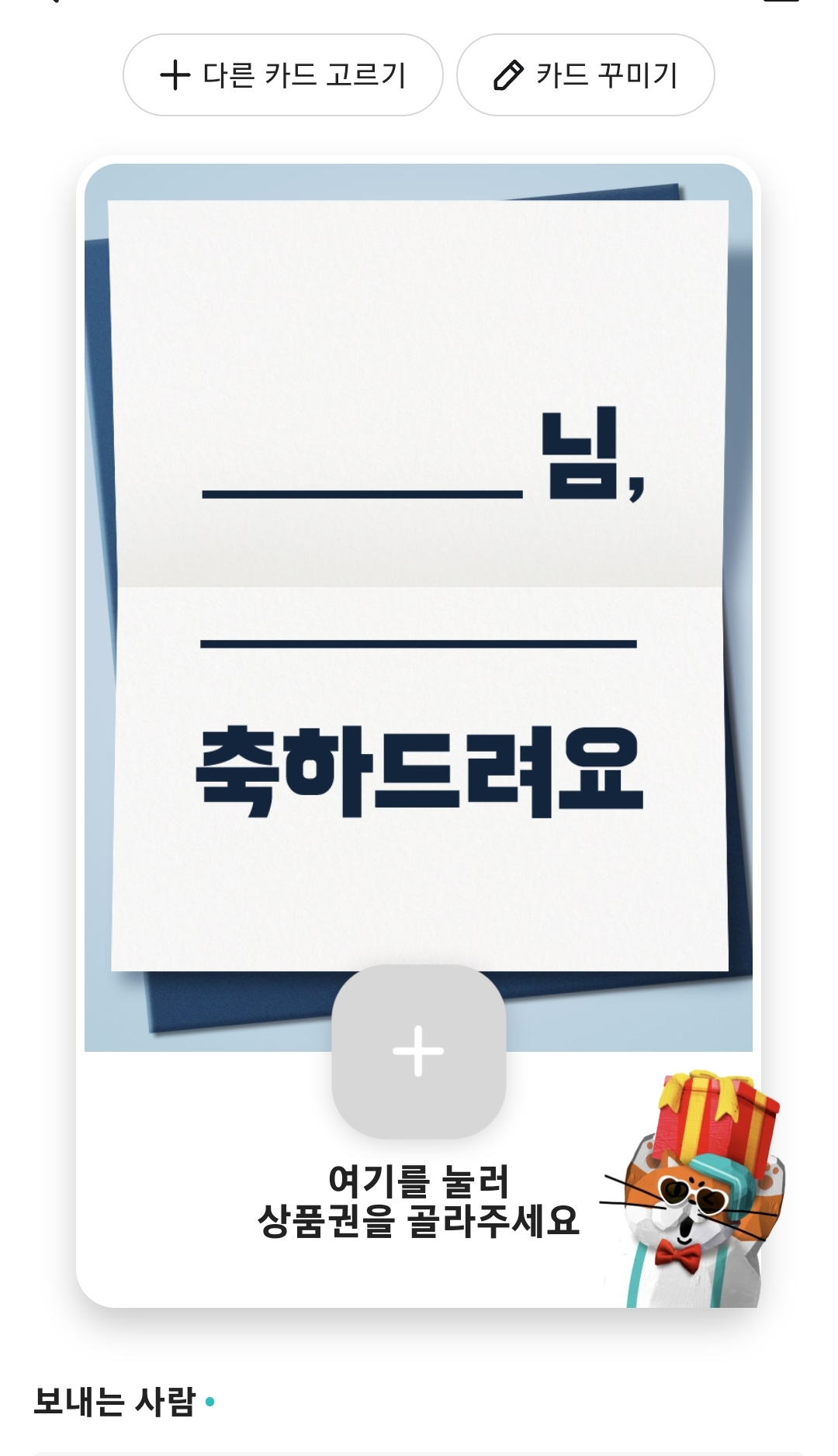3. 배민상품권으로 선택한 뒤 다음 단계를 진행해보겠습니다. 선물을 고르면 이제 선물을 전달할 메시지를 선택하고 입력하게 됩니다. 원하는 디자인을 고른 뒤 메시지에 이름과 어떤 축하를 하는지 넣을 수 있습니다. 상단에 있는 카드꾸미기를 눌러줍니다. 카드를 변경하고 싶으면 다른카드 고르기를 눌러주시면 됩니다.