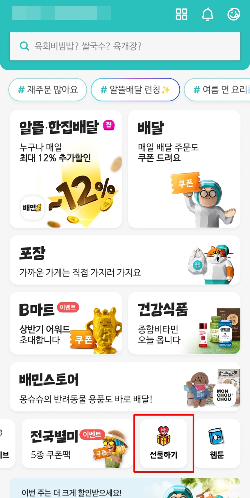 1. 먼저 배달의민족 어플에 접속해줍니다. 어플 접속 시 보이는 '선물하기' 탭을 클릭해줍니다.