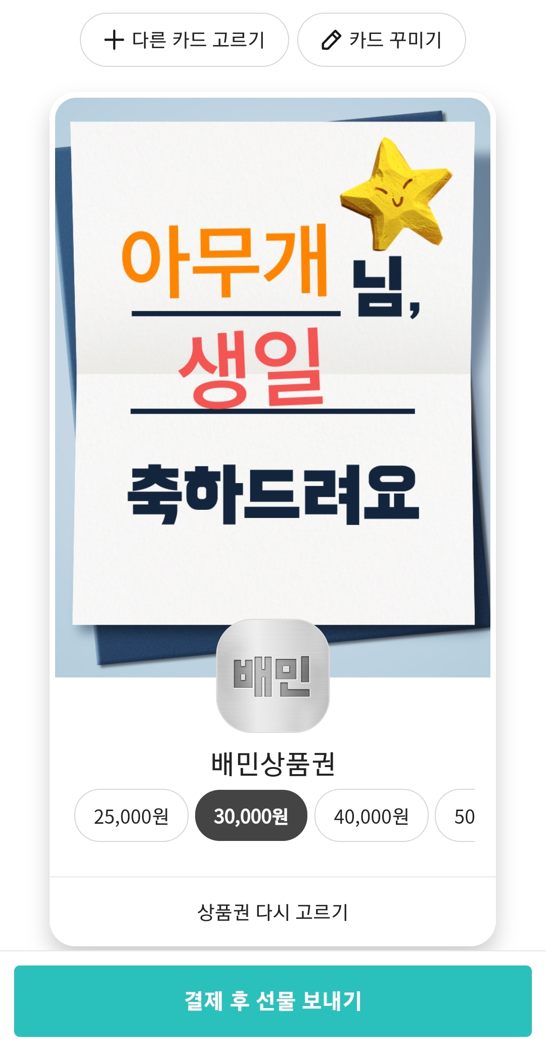 3. 배민상품권으로 선택한 뒤 다음 단계를 진행해보겠습니다. 선물을 고르면 이제 선물을 전달할 메시지를 선택하고 입력하게 됩니다. 원하는 디자인을 고른 뒤 메시지에 이름과 어떤 축하를 하는지 넣을 수 있습니다. 상단에 있는 카드꾸미기를 눌러줍니다. 카드를 변경하고 싶으면 다른카드 고르기를 눌러주시면 됩니다.