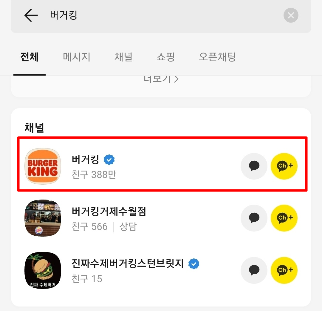 여러 채널 중 맨 위에 있는 파란 인증 표시가 있는 버거킹을 클릭합니다.