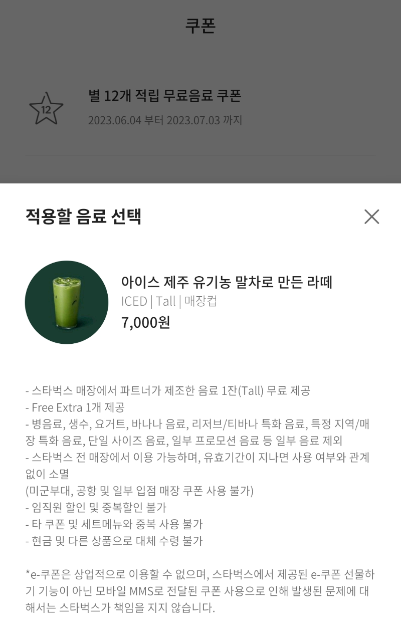 별 12개 적립 무료음료 쿠폰이 뜨는 것을 확인할 수 있습니다. 여기서 적용할 음료인 아이스 제주 유기농 말차로 만든 라떼를 선택해줍니다.