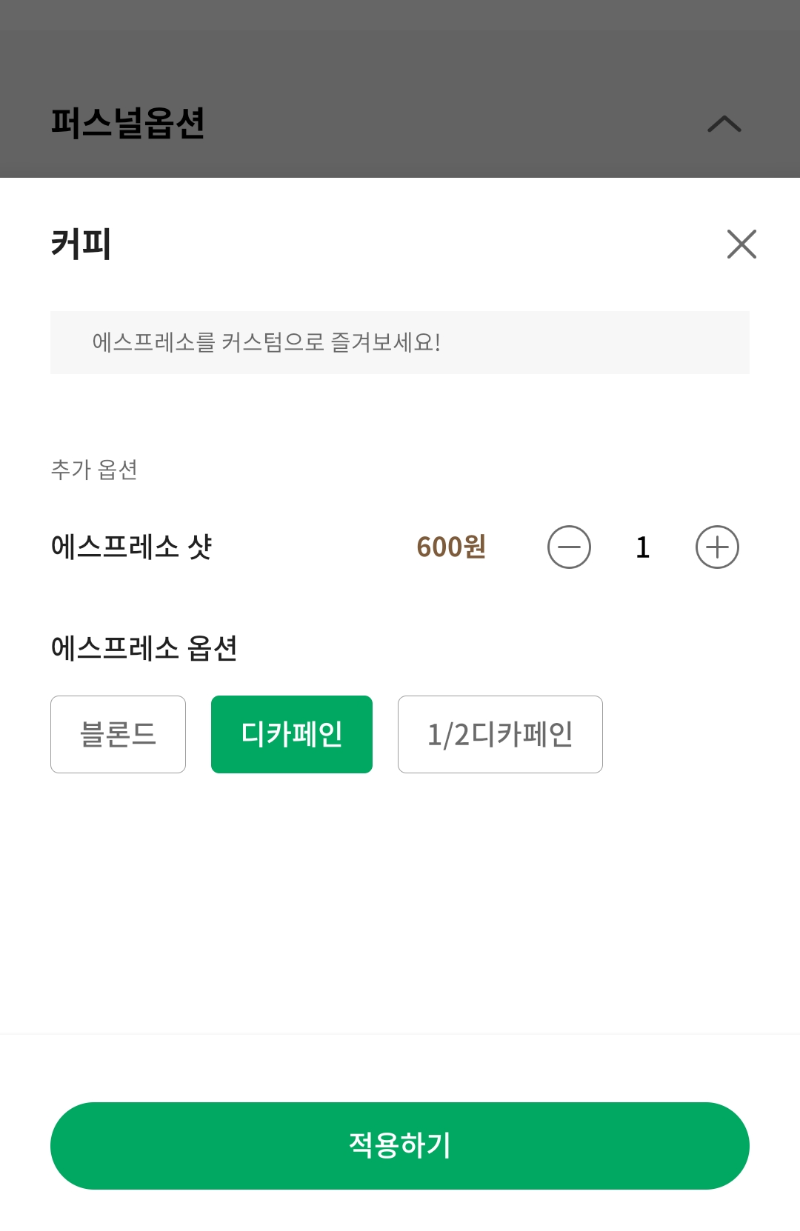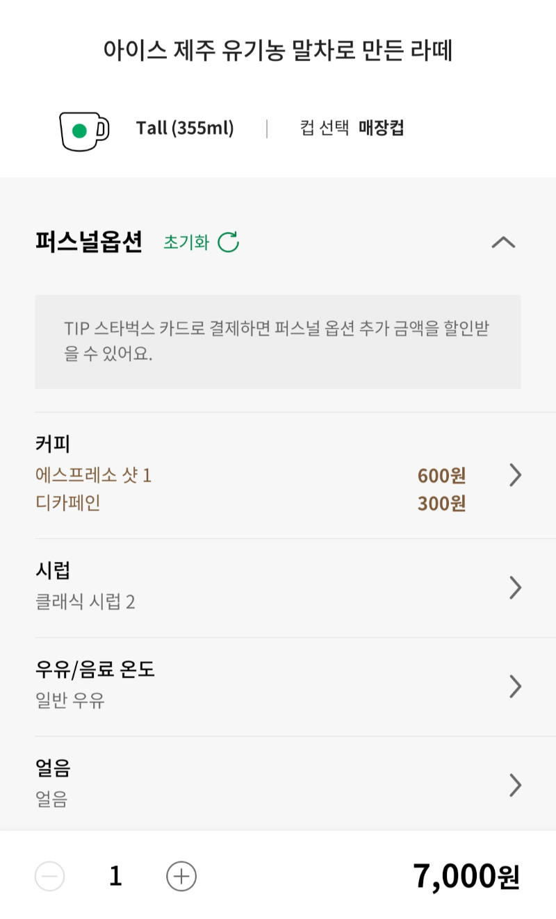 해당 음료 선택 후 퍼스널옵션에서 에스프레소 샷추가를 진행해줍니다. 이미 커피를 한잔 마신 뒤라 디카페인 에스프레소 샷추가를 진행하였습니다. 에스프레소샷을 디카페인으로 추가하자 음료가 7,000원이 되었습니다.