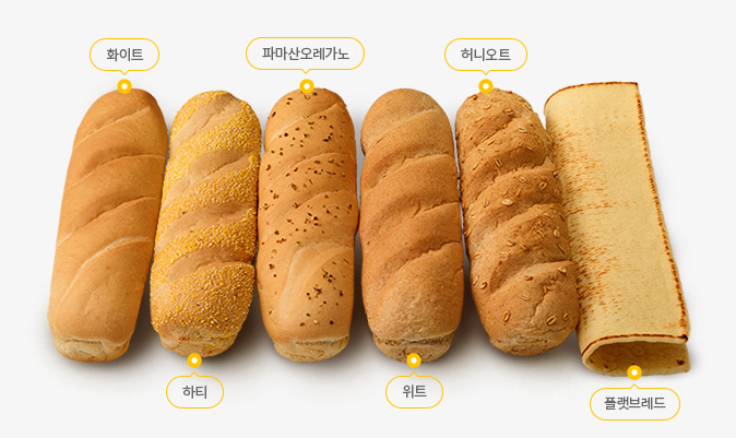 서브웨이 빵은 6가지 종류 중 원하는 빵으로 고르면 되는데 어떤 빵이든 추가비용 없이 선택 가능합니다. 화이트, 하티, 파마산오레가노, 위트, 허니오트, 플랫브레드입니다.