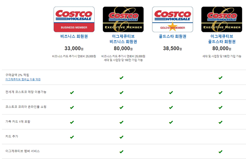 코스트코 회원권은 개인 또는 비즈니스(사업자)로 나뉩니다. 각각 카드에 따라 연회비의 차이가 있습니다. 이그제큐티브는 구매 금액의 2%가 적립되는 카드로 코스트코에서 구매하는 금액이 크다면 이그제큐티브로 적립을 많이 받는 것도 좋은 방법입니다.